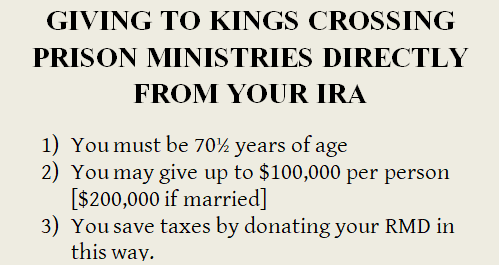 If you have an IRA and are of a certain vintage, you know about “Annual Required Minimum Distributions.” We are grateful to a growing number of supporters who designate Kings Crossing Prison Ministries as the recipient. IRA investments were begun to maximize tax benefits. You can avoid taxes again by making a direct contribution of the annual distribution to a non- profit like Kings Crossing Prison Ministries. You save paying unnecessary taxes and the ministry benefits. It is a “win-win” opportunity.