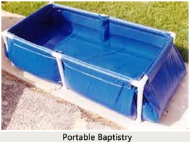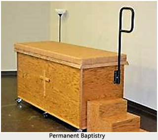 Step #1: Determine if you need a permanent or portable baptistry (the dollar-difference is about $1500). The portable unit ($400 + shipping) is easily stored and transported from one place to another. It also comes with a drain attachment. The permanent unit is more attractive and has a removable communion table-top. Please note the following requirements for ordering a permanent unit. Some churches put a permanent baptistry in prison and also keep a portable one handy for special needs.